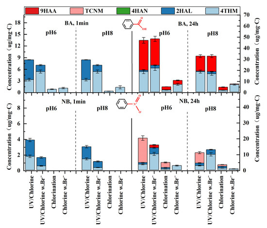 As shown in Figure 2, the 60 s short-term DBP formation and DBPFP of BA and NB were within 5 µg/mg C, indicating that both BA and NB are typical inert DBP precursors. Turning on UV increased their short-term DBP formation to 8.41–8.41 µg/mg C and 5.91–7.62 µg/mg C, respectively, and their DBPFP to 20.98–42.47 µg/mg C and 17.45–33.53 µg/mg C, with more significant activation due to MPUV/chlorine oxidation at pH 6 than at pH 8. The different activation extents of the two precursors may be attributed to their different reactivity with HO• and RCS•, for example, BA has a high reactivity with both HO• and Cl•, while NB mainly reacts with HO• [7,34]. In terms of specific DBP species, after 60 s MPUV/chlorine and post-chlorination, BA mainly formed 18.71–18.72 µg THMs/mg C, 13.73–27.47 µg HAAs/mg C, and 0.53–1.28 µg HALs/mg C, while NB produced 4.00–5.22 µg THMs/mg C, 1.74–4.52 µg HALs/mg C, and 7.41 µg TCNM/mg C. Prior study found that HO• can convert BA to salicylic acid, which is more chlorine-reactive and was considered as an important HAA and/or HAL precursor [35,36]. Nitrobenzene would be converted to nitrophenol during the reaction with HO•, and nitrophenol further generated DBPs, such as THMs, HALs, and TCNM by chlorination [35]. Among them, the significant promotion of TCNM formation due to MPUV/chlorine oxidation of NB in this study is consistent with the previously reported finding that UV/chlorine treatment may potentially lead to increased TCNM formation of nitrogenous precursors [37], which needs to be of concern.