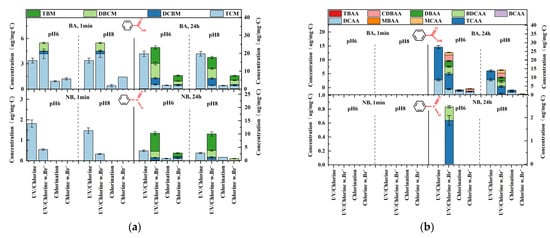 The coexisting Br− in water would react rapidly with HOCl to form HOBr (Reaction 1) [38] and potentially further generate Br−DBPs due to the bromination reaction between HOBr and organic matter [39]. During MPUV/chlorine oxidation, HOBr photolysis would generate reactive bromine radicals (RBS) and HO• (Reaction 2) [40], and on the other side would consume HO• via Reaction (3) [33]. Nevertheless, the coexistence of bromide may affect the composition of radical species during the MPUV/chlorine treatment. The effect of bromide on the DBP formation of BA and NB in the MPUV/chlorine-treated system was shown in Figure 3. For BA, the coexisting bromide slightly promoted the production of DBAA and BCAA during dark chlorination and post-chlorination. With UV on, the coexisting bromide significantly increased the production of Br−THMs (DBCM and TBM) and Br−HAAs (DBAA and BCAA) by 10.34–14.42 µg/mg C and 4.30–5.33 µg/mg C, respectively, although this caused a minor change in the total DBPFP. Similarly, the coexisting bromide caused rare Br−THM formation of NB in the dark, while, with UV on, this promoted the formation of 3.40–3.58 µg DBCM/mg C and 6.83–8.71 µg TBM/mg C, respectively. This promotion effect was probably attributed to the reaction between RBS/HOBr and precursors/intermediates [33].