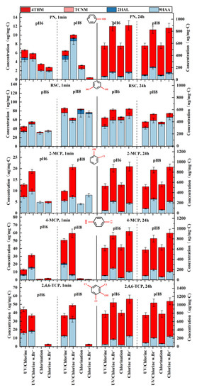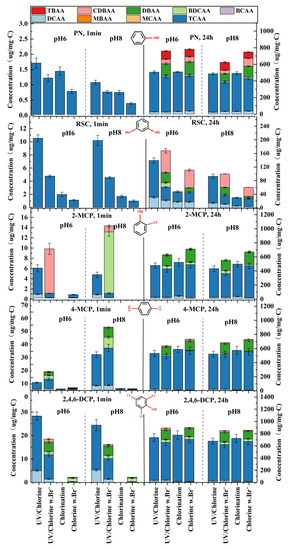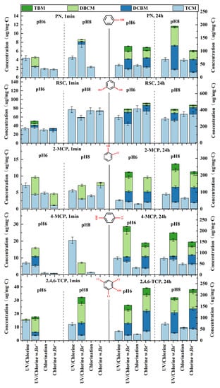 The BSFTHMs and BSFHAAs of the five precursors under different treatment conditions were shown in Table 4. UV/chlorine oxidation increased the BSFTHMs of PN, RSC, 2-MCP, 4-MCP, and 2,4,6-TCP from 1.13–1.19, 0.28–0.33, 1.25–1.33, 1.20–1.30, and 1.21–1.39, to 1.26–1.33, 0.47- 0.56, 1.47–1.51, 1.33–1.44, and 1.23–1.52, respectively. In contrast, BSFHAAs remained almost unchanged. This was basically consistent with the BSF changing trends of the two inert benzene precursors in Section 3.2.2, further reflecting the effect of MPUV/chlorine on brominated THM formation in bromide-contained systems.