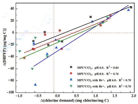 To help in the prediction of MPUV/chlorine-induced changing trends in treated water’s DBPFP (Δ(DBPFP)), the linear correlation between the change in chlorine demand (Δ(chlorine demand)) of the seven model precursors and their DBPFP changes (Δ(DBPFP)) was fitted and shown in Figure 7. A positive correlation was observed in the seven precursors’ ∆(chlorine demand) and their Δ(DBPFP) under each treatment condition, with R2 values distributed between 0.70 and 0.86. Therefore, considering that the measurement of chlorine demand is more convenient and cost-effective than DBPFP, the change in chlorine demand may be considered as a potential indicator to predict the effect of MPUV/chlorine AOP treatment on treated water’s DBPFP and help in the determination of whether the process may pose a potential threat to DBPFP.