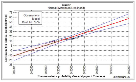 Statistics for the research region’s station, including the number of years, maximum and minimum daily precipitation amounts, mean, standard deviation, and other fundamental data (Table 4). By choosing the curve whose rain points were closest to the storm curve, the normal approach was chosen as one of the ideal probability distributions for rain depth (Figure 5).