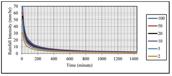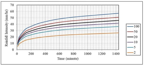 IDF curves were generated from daily rainfall data due to the lack of climate data regarding the intensity of rainfall in the research area. Using Bell’s Ratios, the rainfall value was calculated for the time intervals of 10, 20, 30 min, 1, 2, 3, 6, and 12 h as a percentage of the previously predicted daily rain value for the various recurring times, as shown in Table 5.