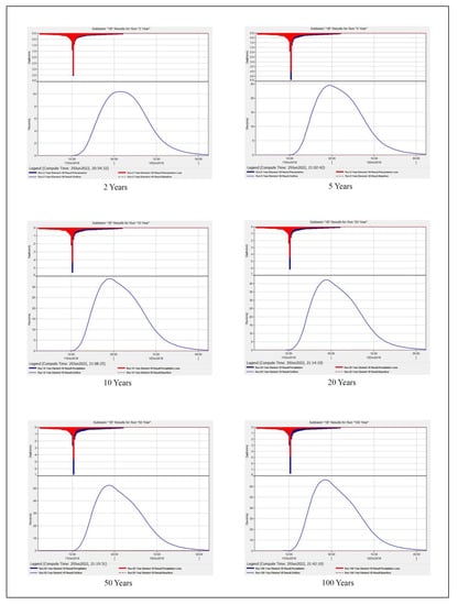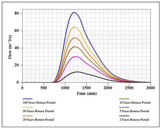 We used a design storm with a 24 h duration, the SCS TYPE II distribution type, and the SCS technique to calculate the concentration-time, delay, and hydrograph curve number (Table 8) for the different recurrence periods of 2, 5, 10, 20, 50, and 100 years. The hydrograph of the torrential waters in the Khazir River drainage basin was analyzed, and the results showed that the volume of the discharge ranged between 29,680 and 2,229,200 m3 during the various return periods and that the maximum flow of the peak discharge was between 10.4 and 66.4 m3/s during the various return periods. The features of the Khazir River’s torrential flows are shown in Table 9 and Figure 8 and Figure 9 using the WMS and HEC-HMS software.