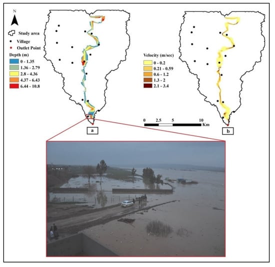 The process of creating a flood plain map model and the depth, velocity, and spatial distribution of flood waters depended on entering the Khazir River’s maximum flow rate, which in 2013 was 372.15 m3/s following three days of intense rain that resulted in the formation of water torrents within the river and its basin. The total area of the flood was 11,188.14 m2, the surface area of the agricultural fields near the riverbank that were flooded was 10,402.14 m2, the surface area of the residential structures that were flooded was 786 m2, and the volume of flood water was 30,207.97 m3.