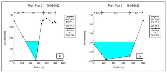 The hydraulic characteristics of the Khazir River were calculated using a steady one-dimensional flow model using Equations (1) and (2). The conventional step approach is used to calculate the water surface height and the energy degree line for two neighboring cross-sections [34].