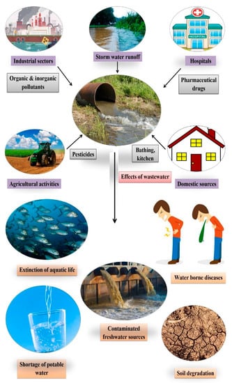 The phrase “wastewater” can be defined as “any water whose chemical, physical or biological composition has been changed as a result of direct discharge of multiple pollutants into water bodies either from urbanization, agricultural, industrial or domestic activities hence making it unsuitable for potable and other purposes” [1]. Generally, wastewater may constitute huge amounts of inorganic compounds, organic pollutants, sediments, pathogenic microorganisms, oxygen demanding wastes and nutrients like phosphorus and nitrogen [24]. In addition, the composition of wastewater is strongly influenced by its sources: for instance, wastewater discharged from the swine industry represent increased phosphorus and nitrogen levels, as compared to municipal wastewater, while wastewater coming from dairy, starch, brewery or potato-processing industries reflects an enhanced proportion of soluble chemical oxygen demand [15]. However, this speedy generation of wastewater from multiple non-pointed (agricultural and urban run-off) and pointed (industrial effluents, municipal sewage, combined sewer overflows) sources contaminates our environment, and is responsible for inducing certain unacceptable changes in aquatic habitat, ultimately leading to harmful effects such as the occurrence of water-borne diseases (diarrhea, typhoid), shortage of drinking water, extinction of aquatic life, contamination of freshwater sources, and many more [23,25,26], as shown in Figure 1.