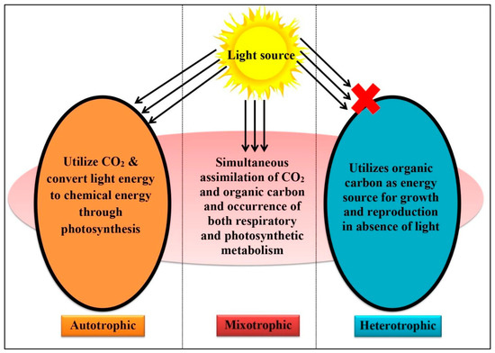Microalgae are defined as a prevalent class of oxygen-producing photosynthetic organisms, analogous to plants, which extensively survive in multiple water environments, including marine and freshwater and a diversity of wastewaters, such as industrial, agricultural, municipal and many more. Microalgae possess a great variety of industrial applications along with biological importance, such as carbon sequestration, photosynthesis thus producing oxygen, and the utilization of nutrients such as nitrogen and phosphorus from wastewater [27,28,29]; therefore, the coupling of microalgae cultivation with wastewater treatment can be seen as a promising approach to growing algae, accompanying the wastewater treatment process [30]. Importantly, microalgal cultivation is supported by the presence of an extreme concentration of nutrients (nitrogen, phosphorus) in the wastewater, as high quantities of carbon will result in a faster growth rate [31,32]; moreover, light intensity, light quality and photo-bioreactors (open or closed) promote algal cultivation [33]. The main requirement of light in algal cultivation is for carbon fixation, enhancing the growth rate of the algae [34,35]. Microalgae may possess various kinds of metabolism, including autotrophic, mixotrophic and heterotrophic [36], as shown in Figure 2; therefore, selecting an appropriate cultivation system for microalgae is a principal step towards influencing the algal growth rate and the efficiency of the desired process.