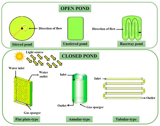 On the basis of the design conditions, there are two types of cultivation systems: open and closed pond systems, as shown in Figure 3. In an open system, algae are generally cultivated in open area surroundings, such as scrub, deep channels, tanks, lagoons, shallow circulating units and raceway ponds [37,38]. In this type of system, nutrition and water are provided to microalgae by channeling runoff water from neighboring water treatment plants, industrial disposal water or land areas [32]. The most commonly used type of open pond system is the raceway pond, because of its efficiency in generating a high amount of microalgae for economic application. The major drawback of raceway pond systems is that they are an obstacle to controlling the surrounding environment conditions, such as weather and temperature, which possess a direct influence on biomass productivity [39]. To overcome the issues associated with open pond cultivation systems, photo-bioreactor (PBR) technologies have been designed, in which algae are cultivated in vessels with transparent walls, and are exposed to artificial light, thus enabling photosynthesis. PBR allows the cultivation of microalgae for a longer period, as compared to open pond systems, hence producing a high amount of algal biomass [32,38]. There are multiple types of closed photo-bioreactor systems, such as the flat plate type, the tubular type and the column type of photo-bioreactors, which are more productive and practical for algal cultivation, because of their efficiency in significantly controlling the surrounding environment conditions, such as temperature, pH and CO2 concentration, and further reducing the chances of contamination [32]. The increased cost of maintenance and construction is a major challenge associated with closed photo-bioreactor systems: however, few studies have communicated that this high cost can be minimized by utilizing wastewater as a growth medium, employing cheap and efficient materials and energy-effective pumps [40].