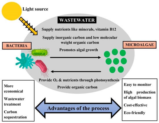 Presently, the major wastewater treatment methods include physical methods (filtration screening, sedimentation, membrane filtration), chemical methods (ion exchange, chemical precipitation, electrochemical treatment, adsorption) and biological methods (bioprecipitation, biosorption, biological activated sludge) [2,6]. The positives of these methods for treating wastewater are very well known, but the methods are also associated with certain limitations, such as irregular removal efficacy, and the uneconomical and increased cost of installation, which can increase the problem of successive treatment, resulting in secondary pollution [7]. Similarly, biological methods are related to the problems of kinetics, maintenance of a favorable environment and the low biodegradability of some pollutants. As compared to bioprecipitation and biosorption, activated sludge is a more beneficial method, enabling high removal of suspended solids and biochemical oxygen demand: however, there are also issues of poor decolorization and the possibility of sludge foaming and bulking [8]; therefore, scientists are searching for more effective and sustainable methods of treating wastewater—in which regard, microalgae have received increased attention. “Microalgae” is a common term that is generally used to describe photosynthetic microorganisms, such as prokaryotic cyanobacteria and eukaryotic microalgae [9]. Microalgae and wastewater treatment have been connected to one other from ancient times [10,11]. Oswald and Gotaas [12] initiated the utilization of algae to decontaminate sewage in the 1950s, which opened the doors for incorporating algae into wastewater treatment: this was because microalgae exhibit a more remarkable ability to consume nutrients, which accounts for around 80–100% for phosphorus and nitrogen, offers a high carbon fixation rate, and can also solve the energy-related problem [13,14,15,16,17]. More recently, it has been stated that the co-cultivation of microalgae with other microorganisms, which are either present naturally in their growth media or added, is a more promising approach, which could assist the process of cell division, in addition to producing an extensive variety of metabolites, which would have great economic significance [18]: this is because the integration of microorganisms into various metabolic activities permits the development of a powerful biological system, which can function under varying nutrient loads and environmental conditions [19,20,21]. The symbiotic relationship between algae and other microorganisms was first outlined in the early 1950s, in the process of boosting the supply of oxygen in oxidation ponds at wastewater treatment plants [18]. Moreover, collaborative relationships can be developed among the microorganisms by incorporating consortiums that can enhance the rate of nutrient removal [9]. Existing studies have demonstrated that the presence of microorganisms such as fungi or bacteria in algae cultures can initiate a positive influence in algal cell growth [22,23].