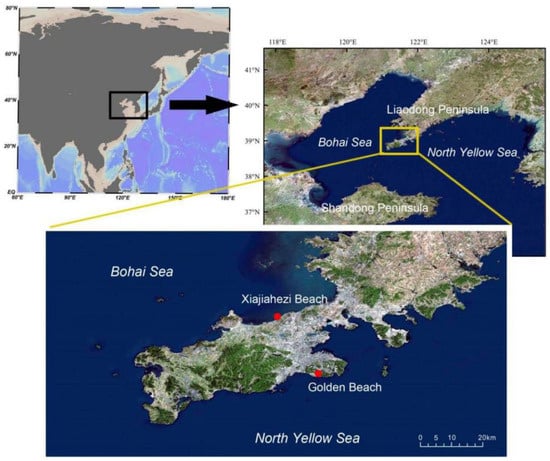Dalian city is located in the warm temperate zone of the Northern Hemisphere. It has a warm temperate continental monsoon climate with maritime characteristics. There are no severely cold days in winter and no severely hot days in summer. The average temperature of the city is 10.5 °C, and the annual precipitation is from 550–950 mm. Dalian city sits along the Yellow Sea on the east and the Bohai Sea on the west. The studied beaches, namely Golden Beach and the Xiajiahezi Beach, are located on the coast of the North Yellow Sea and the Bohai Sea, respectively (Figure 1). Since both of them were open to public access, human impact can be considered as relatively high. The two studied beaches are only approximately 20 km apart, but hydrographical and sedimentological heterogeneity existed between the two beaches (Table 1).