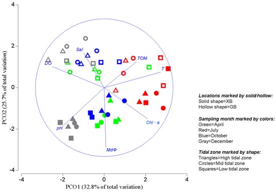 Principal coordinates analysis (PCO) output based on environmental variables. Vectors are the Pearson correlations of variables with the PCO axes. Abbreviations: XB, Xiajiahezi Beach; GB, Golden Beach; T, sea water temperature; Sal, sea water salinity; DO, sea water dissolved oxygen; Chl-a, Chlorophyll-a; TOM, total organic matter; MdΦ, medium particle diameter.