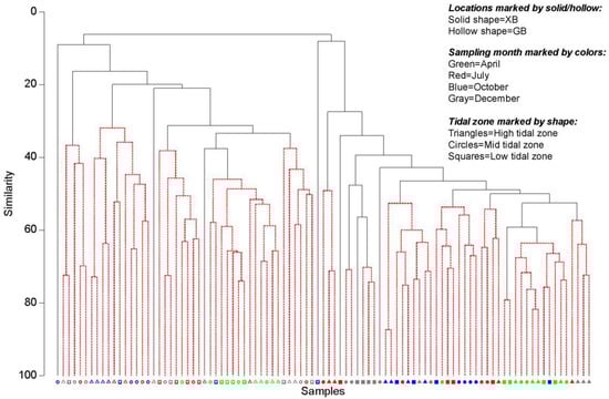 A total of 84 putative species of marine nematodes (70 and 41 putative species on XB and GB, respectively) were identified, belonging to 60 genera and 23 families. Xyalidae, Chromadoridae, Tripyloididae, Cyatholaimidae, Comesomatidae prevailed at XB, contributing 87.8% to the whole nematode community. Chromadoridae, Oncholaimidae and Enoplidae were the dominant families at GB, accounting for 67.8% of the whole community. The dominant species (≥5%) at XB were Daptonema sp. 2, Paracyatholaimus sp. 1, Daptonema sp. 1, Sabatieria sp. 2, Daptonema sp. 3, Setosabatieria sp. 1, Prochromadorella sp. 1, and Bathylaimus sp. 1, while the dominant species at GB were Oncholaimus sp. 1, Chromadorita sp. 1, Enopolaimus sp. 1, Promonhystera sp. 1, Oncholaimus sp. 2, Enoplus sp. 1, and Dichromadora sp. 1. The result of SIMPER analyses showed a 93.4% dissimilarity in nematode species composition between the two locations (Table 3). The major species providing the discrimination among tidal zones and sampling months also varied at each location (Table 3).