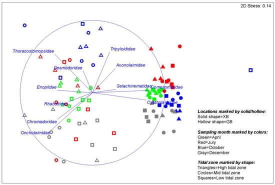 Non-metric multidimensional scaling (nMDS) of nematode community. Nematode species data were standardized and fourth root transformed. Vectors overlain on plot show correlations of families (>0.3) with nMDS axes, indicating important families that differentiate the communities.