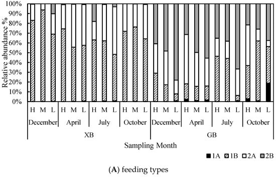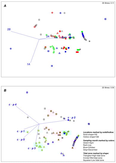 Non-selective deposit feeders (1B) dominated at XB sites (67.9 ± 12.8%), followed by epistrate feeders (2A, 28.8 ± 12.7%). The relative abundances of omnivores/predators (2B, 2.9 ± 5.5%) and selective deposit feeders (1A, 0.3 ± 0.3%) were low (Figure 5A). In contrast, the relative abundance of 2B nematodes was the highest (44.1 ± 16.5%) at GB sites. The mean relative abundance of non-selective deposit feeders was 27.2 ± 17.6%, and that of epistrate feeders was 26.3 ± 13.0%. The mean relative abundance of selective deposit feeders was the lowest (2.5 ± 5.2%) (Figure 5A). nMDS results showed a clear differentiation between the two locations, and the differences in the abundance of 1B and 2B were conspicuous between the two locations (Figure 6A).