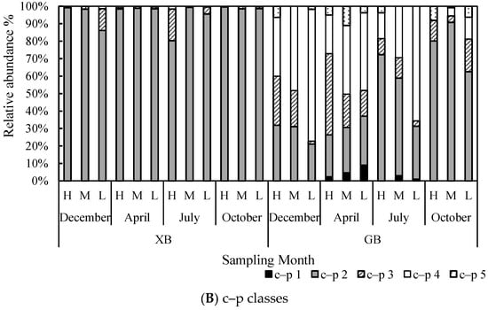 At XB sites, nematodes with a c–p class of 2 dominated (96.0 ± 6.1%), followed by nematodes with c–p classes of 3 (3.5 ± 5.7%) and 4 (0.5 ± 0.5%). No extreme colonizers (c–p = 1) and extreme persisters (c–p = 5) were observed. At GB sites, nematodes with c–p classes of 2 were also dominant (46.1 ± 24.7%), followed by nematodes with c–p classes of 4 (32.5 ± 23.4%) and 3 (15.8 ± 12.5%). Additionally, extreme colonizers (e.g., Rhabditis) and extreme persisters (e.g., Enoplus) were observed at GB sites, and their relative abundances were 1.7 ± 2.8% and 3.9 ± 3.6%, respectively. The proportions of c–p classes were observed as being relatively consistent among the sampling months at XB sites (Figure 5B). In contrast, a fluctuation in the proportions of nematodes with different c–p classes was observed at GB (Figure 5B). nMDS results based on the c–p classes data also showed a clear differentiation between the two locations, and the differences in the abundance of nematodes with c–p = 2 and c–p = 4 were conspicuous between the two locations (Figure 6B).