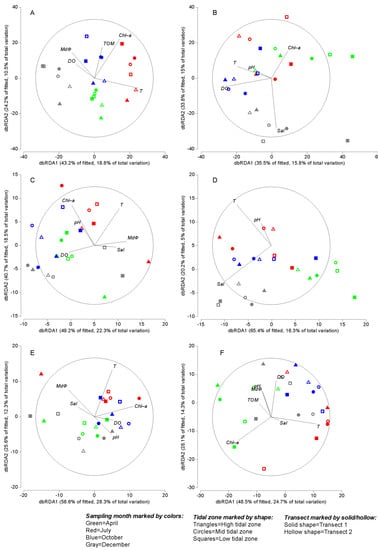 dbRDA ordination for the fitted model of nematode data (based on Bray–Curtis after fourth root transformation of abundances) versus environmental variables at XB (A,C,E) and GB (B,D,F) separately. (A–B) species composition; (C–D) feeding types; (E–F) c–p classes. When categorical variables are included in a DistLM analysis, then the length of each categorical vector is a measure of the strength of the relationship between that category and the dbRDA axes.