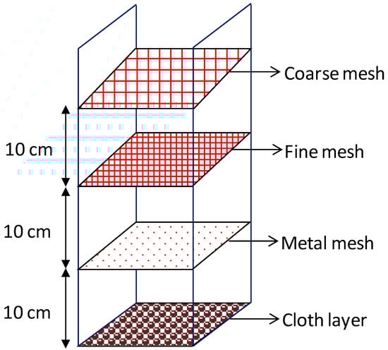 Before setting up pilot plants, lead up studies were performed on the bench scale SHEFROL® units and other contraption for these studies were manufactured using locally available and un-branded materials. Later the pilot plants were also set-up in the same manner as described later in this section. In order to trap food particles and oily substances, a four-tier filter unit was designed (Figure 1) and fabricated. Its top tier was made up of coarse mesh to hold vegetable pieces and similarly large particulates. The second tier aimed to remove rice and particles of similar size. Further down a strainer-type metal mesh was put to block-off tea powder and similar-sized particulate. The last tier had a cloth to separate still finer particles. A jute bag layer was kept directly below the cloth to soak oil.