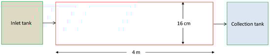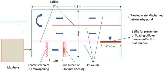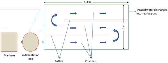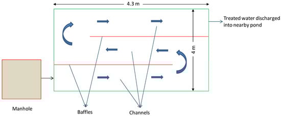 After the success with the lead-up studies, a pilot scale SHERFOL®-II unit was installed near one of the manholes in the Pondicherry University campus which was attached to the pipe that carried the canteen wastewater from its source to the dumping site (artificial pond). As the space available for SHEFROL was limited, the system had to be sized to fit in that space while aiming to treat the average flow of 12,000 L per day (LPD) at the HRT of 5 h. The sizing was based on previous studies [], which have indicated that an HRT of Ca 5 h provides the best trade-off between the rate of treatment and its extent to the SHEFROL® channels. The system dimensions were as in Figure 4.