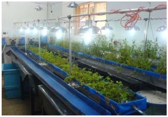 Bench−scale SHEFROL® channels (Figure 2) were fabricated and tried indoors (Figure 3) under simulated sunlight following the procedure standardized earlier [,]. After exploratory studies showed the systems to be working smoothly, a five-channel SHEFROL reactor was set outdoors. Four of its channels were used to explore the efficacy of different macrophytes of which two, Eichhornia crassipes and Pistia stratiotes, are free-floating aquatic weeds while the other two—Marsilia quadrifolia and Alternanthera sessilis—exist in nature as rooted in soil. The fifth channel served as control. A common equalization tank served all the channels, thereby ensuring that the characteristics of the wastewater entering all the channels were identical.