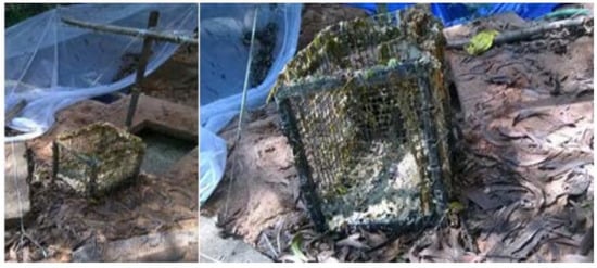 To exercise better control over coarse solids and oily material, a rectangular strainer (Figure 7) was fixed below the mouth of the inlet pipe to black-off coarse solids. A cylindrical sedimentation tank of 1000 L was added upstream of the SHEFROL® channel (Figure 8). It was a sintex tank of which top was cut-off. Besides straining, the wastewater was passed through a jute bag to separate much of the oil. The whole unit was covered with nylon (Figure 7) to prevent dried leaves from the nearby trees from falling into the system (which would have contributed COD as well as particulates).
