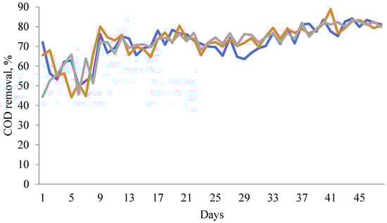 Removal of COD in the channel planted with E. crassipes, in SHEFROL®-I. Red, gray and blue curves represent COD removal occurring at 10, 14, and 18h, respectively.