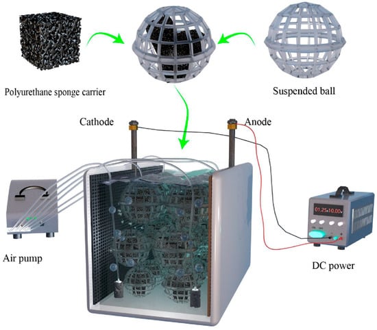 The 3D-BERs are shown in Figure 1. The reactor is a rectangular high-density polyethylene tank (200 mm × 150 mm × 300 mm) with an adequate working volume of 5 L. The anode plate is a Ti-IrO2 electrode (300 mm × 200 mm) and the cathode plate is a pure titanium mesh placed on both sides of the reactor with a thickness of 2 mm, and the two electrodes are connected to the positive and negative DC-regulated power supply. A combined suspension ball polyurethane sponge carrier of Φ60 mm and Φ90 mm (filling rate of 50%) is filled between the electrode plates, and the filling rate of the polyurethane sponge carrier in each individual suspension ball is 30–50% to form a 3D biofilm electrode by loading the biofilm. The polyurethane sponge carrier is a medium-pore carrier (20 mm). Suitable micropores can maintain not only an appropriate number of microorganisms, but also a good biofilm structure and activity. The high surface area provides a huge breeding ground for EAMs. During enrichment, electrical acclimation helps to form EAMs with an EET, which plays the same role as conductive particles, thus increasing conductivity and forming a new type of 3D-BER, which is beneficial to the degradation of refractory pollutants [20]. Six aeration heads were uniformly arranged at the bottom of the reactor to regulate dissolved oxygen and provide agitation. An unpowered control group was set up during the experiment, and all experimental materials and conditions were the same as the 3D-BERs. A DC regulated power supply (MS303D-30V10A) was manufactured by Maisheng Power Supply (Dongguan, China), and the air pump (S-30B) was purchased from Sailor Lipa (Ningbo, China).