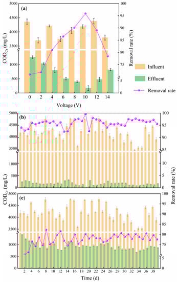 CODCr removal rate of pharmaceutical wastewater in 3D-BERs (a) under different voltages; (b) under a voltage of 10 V; and (c) under a control group (no power).