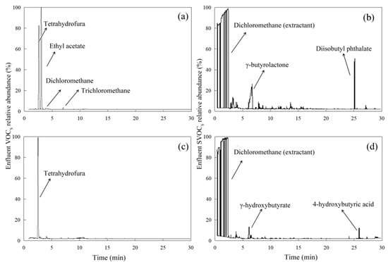 GC-MS spectra of pharmaceutical wastewater degradation process. (a) Electro-Fenton effluent of VOCs; and (b) SVOCs; (c) 3D-BERs effluent of VOCs; and (d) SVOCs.