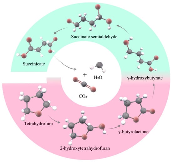 The isolation of tetrahydrofuran-degrading bacteria was reported, and the metabolic mechanism was also explained in detail. The refractory biodegradability of THF is mainly reflected in the C-O (360 kJ/mol) high-energy bond and low biodegradability in its cyclic ether structure [27]. In the research on the degradation of THF by Rhodococcus sp. Strain 219, it was speculated that the degradation pathway of THF is that THF undergoes hydroxylation of the ortho-position carbon atom of the oxygen atom to generate 2-hydroxytetrahydrofuran, which is then oxidized to γ-butyrolactone, and then ring-opened to generate γ-hydroxybutyrate, which is finally further oxidized to succinicate, entering the tricarboxylic acid cycle and being thoroughly mineralized [28]. Combined with experiments, it is speculated that the main metabolic pathway of THF is shown in Figure 4. Its metabolic pathway is more detailed: γ-hydroxybutyrate is oxidized to succinate semialdehyde and then oxidized to succinicate, which is then degraded to glycolic acid, and finally mineralized into CO2 and H2O.