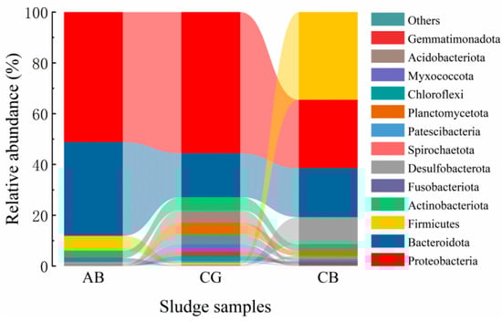 The composition and abundance of the microbial community in 3D-BERs at the phylum level are displayed in Figure 5. Proteobacteria is the predominant species, with the percentages near the anode and cathode being 51.18% and 26.96%, respectively. Proteobacteria are Gram-negative bacteria, one of the largest bacterial phyla in the bacterial kingdom, belonging to obligate or facultative anaerobic bacteria. Extracellular electron transfer capability is widespread in the field of water treatment [30]. Bacteroidota, Firmicutes, Desulfobacterota, and Actinobacteriota were subdominant groups, accounting for 46.57% and 67.15% of the total taxa. Compared to the CG, the electric field in the 3D-BERs prompted the relative abundance and growth of Firmicutes, Proteobacteria, which are the main bacterial phyla for the biochemical system to deal with the degradation of organic matter in pharmaceutical wastewater [31]. The relative abundance of Proteobacteria in AB and CB samples was lower than that in the CG, which may be due to the screening effect of electrochemical action on Proteobacteria, leading to a decrease in their relative abundance. Bacteroidota are chemo-organotrophic bacteria with the ability to degrade complex carbon sources and macromolecular organic matter such as lipids and proteins [32]. Combined with GC-MS analysis, it can be seen that 3D-BERs show obvious removal effect on lipids such as γ-butyrolactone and diisobutyl phthalate, which may be the results of biofilm enrichment of Bacteroidota near the anode and cathode. The relative abundance of Firmicutes in the AB and CB was 5.79% and 34.54%, respectively. It can be seen that the electric field has an enrichment effect on Firmicutes. Most of them are facultative anaerobic bacteria and electricity-producing microorganisms that obtain energy for growth by oxidizing sugars or organic acids [33]. Firmicutes are found to be the main dominant phyla in antibiotic wastewater treatment [34]. Therefore, Firmicutes microorganisms are enriched near the cathode, and with succinic acid. The degradation product of THF may be used as a carbon source to realize the treatment of pharmaceutical wastewater by the 3D-BERs.
