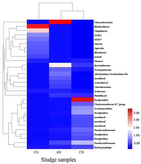 The composition and relative abundance of microorganisms at the genus level further revealed the evolution of the microbial communities in the 3D-BERs. As shown in Figure 6, the top 30 microbial genera (TOP30 genera) in relative abundance were selected from the three samples, and the dominant genera obtained at the genus level were analyzed. Due to the mutual synergy of electric field stimulation and domestication of pharmaceutical wastewater, the dominant bacterial genera near the cathode and anode plates in the 3D-BERs were significantly different from the CG. There were also significant differences in the dominant bacterial genera between the cathode and anode plate samples.