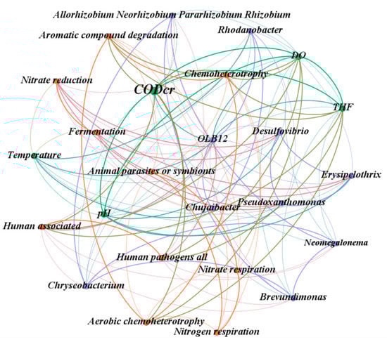 In summary, under the combined effect of electric field stimulation and domestication of pharmaceutical wastewater, many bacterial genera can utilize refractory biodegradable substances on the biofilm of 3D-BERs, and some bacterial genera can metabolize the electrochemical oxidation of refractory biodegradable substances and the intermediate products of electrochemical oxidation of refractory substances. At the same time, the CODCr range is 3438.30–4775.70 mg/L, and the threshold condition is greater than 0.9; we have also predicted the metabolic pathways. As shown in Figure 7, Chryseobacterium, Brevundimonas in the anode and Erysipelothrix, Pseudoxanthomonas, Desulfovibrio, and other dominant bacteria genera in the anode utilize chemoheterotrophy, aerobic chemoheterotrophy, fermentation, and aromatic compound degradation. Among them, Chryseobacterium and Desulfovibrio are very critical to the degradation of THF. In combination with electrode plate electro-oxidation, THF can be completely mineralized, which is a fundamental factor for the 3D-BERs to improve the efficiency of microbial degradation of pharmaceutical wastewater.
