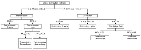 Water distribution network classification flowchart. represents the length-weighted average pipe diameter, is the Branch Index, and is the Meshedness Coefficient for the reduced network. Source: Hwang and Lansey [34].