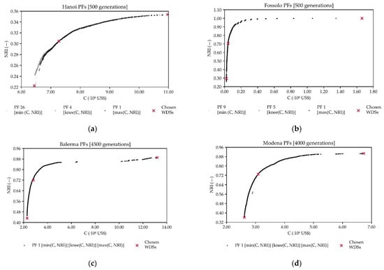 Selected individuals from retrofitted OPUS/NSGA-II PFs for the: (a) Hanoi WDS; (b) Fossolo WDS; (c) Balerma WDS; and (d) Modena WDS.