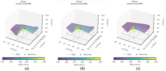 Hanoi WDS with the corresponding HGL surfaces for the: (a) [min(C), min(NRI)]; (b) [knee(C), knee(NRI)]; and (c) [max(C), max(NRI)] configurations.