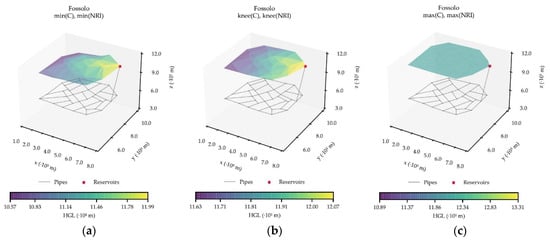 Fossolo WDSs with the corresponding HGL surfaces for the: (a) [min(C), min(NRI)]; (b) [knee(C), knee(NRI)]; and (c) [max(C), max(NRI)] configurations.
