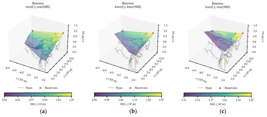 Balerma WDS with the corresponding HGL surfaces for the: (a) [min(C), min(NRI)]; (b) [knee(C), knee(NRI)]; and (c) [max(C), max(NRI)] configurations.