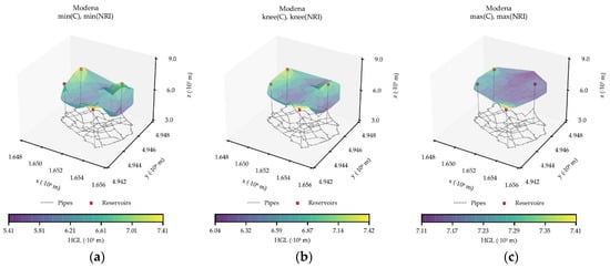 Modena WDS with the corresponding HGL surfaces for the: (a) [min(C), min(NRI)]; (b) [knee(C), knee(NRI)]; and (c) [max(C), max(NRI)] configurations.