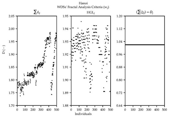In the case of the criterion for Hanoi, Figure 7 shows that the fractal analysis methodology is consistent, as solutions for the fractal dimension approach to a value of D = 2. Finally, note that the weight in Figure 7 produces a single value of D = 1.02 for all considered individuals, condition that may be an indicator of equal flow rate distribution in all selected networks in a retrofitted OPUS/NSGA-II PF. A same outcome for all individuals may indicate that all networks provide an equal flow rate dispersion, that is, they demonstrate an equal performance in terms of demand supplied to users. All the fractal analysis criteria applied to Hanoi as notions for the design of TDLs are preliminary but represent a further step in optimized network design. It is necessary to examine an elevated number of optimal network designs in the same category to find conclusive values of D, which can help to design optimal water networks of this type. It is important to obtain results by WDS classification, as different topological arrangements of networks can demonstrate different behaviors in fractal dimension (D), as Figure 7 and Figure 8 exhibit.