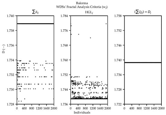 It is also important to note that Hanoi is a very small and symmetric network, which is not as desirable in fractal analysis since fractals are by nature chaotic shapes. It is picked because analyzing it has a very low computational cost. On the other end is Balerma, a network more than tenfold larger in number of nodes. The analysis of this Pareto Front shows clearer patterns that have already been mentioned. The most interesting one is the fact that most individuals tend to some fractal dimension for each of the criteria. Not only that, but the value is in fact the same for the three criteria (1.739). That is very telling: most optimal designs for this network have a very similar distribution in space regardless of the criterion used. This is not tremendously surprising, since two of the three conditions are in fact the same (the topological coordinates). However, it does imply that the three criteria are related in its distribution in space; there is some proportionality between the diameter (), HGL () and flow rate [] criteria, at least for the Balerma network. It is therefore something worth looking at using other networks of a similar size. However, the question is why some of the networks do not converge to that same value. When observing Figure 8, it is evident that individuals along the whole front are out of that limit value; from the end with lower cost and lower NRI to the other end with the higher values. Therefore, this condition might not necessarily be related to the position on the front but to some other characteristic of the network.