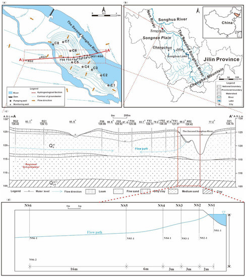 The study area is located in northeast China. It has a flat terrain with elevation between 131 m and 136 m. The annual average temperature in the study area is 4.7 °C, the annual average rainfall is 425.7 mm, and the annual evaporation is 1594 mm. As the largest river system in Jilin Province, the Second Songhua River flows through the north of the study area from southeast to northwest. The water depth and width of the river surface are 400–450 m and 3–7 m, respectively. The annual average runoff is 476.0 m3/s. During the dry season, which generally occurs in May, the minimum runoff is 63.3 m3/s, and the water level is 130.12 m. During the wet season, which usually occurs in August, the maximum runoff is 6750 m3/s and the water level is 134.96 m. The annual water level varies from 1.8 m to 4 m, with strong seasonal variations. It is higher during July–September and lower during October–March. The content of fine particles in the nearshore riverbed (within 100 m from shore) is high, and the vertical permeability is poor. The Kv value is 4.82~6.57 m/d, with an average of 5.82 m/d. In the far-bank riverbed (100~400 m from shore), the content of coarse particles in the surface sediments is high, the vertical permeability is better, and the Kv value is large, 36.39~59.37 m/d, with an average of 48.93 m/d.