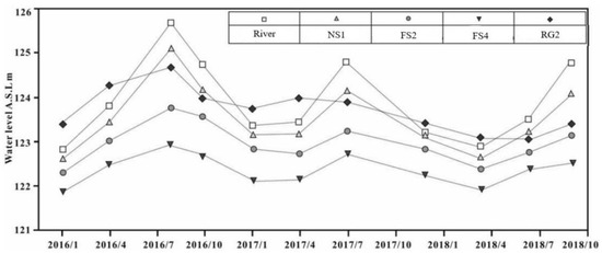In September 2018, the hydraulic gradients along the river to NS1 (within 2 m from the bank), NS1–NS6 (2–30 m from the shore), NS6–FS3 (30–420 m from the shore), and FS3–FS4 (420–700 m from the shore) were 79.53‰, 8.62‰, 2.12‰, and 2.63‰, respectively.