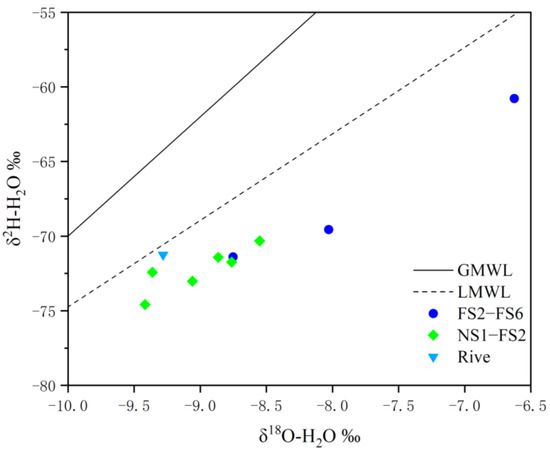 Samples of river water and 11 wells (NS2, NS4, NS5, NS6, FS1, FS2, FS3, FS4, FS6, RG1 and RG2) were collected to test δ2H and δ18O values. River water is the main recharge source of groundwater in the study area. The Second Songhua River originates in the Changbai Mountain (altitude: 2750 m). Affected by the elevation, hydrogen and oxygen isotopes are relatively depleted in the river water, with average δ18O and δ2H values of −9.28‰ and −71.24‰, respectively. The regional groundwater is affected by evaporation, and the hydrogen and oxygen isotopes are relatively enriched, with average δ18O and δ2H values of −8.08‰ and −68.67‰, respectively.