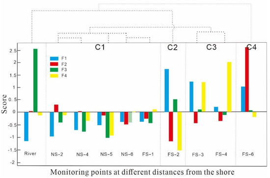 The first group (C1) includes NS2, NS4, NS5, NS6, and FS1 (within 80 m from shore), which are closer to river water. Figure 6 shows that river water and C1 are mainly controlled by factor F3. F3 has high scores in river water but low scores in observation wells in the C1, indicating that the two can be separated through F3 (aerobic respiration and denitrification). The second group (C2) included FS2 (within 80–200 m from shore) mainly controlled by F1 and F4. The F4 score dropped to the lowest and F1 score was higher. The results indicate that C2 can be distinguished by sulfate reduction and leaching. The third group (C3) including FS3, FS4 (within 200–700m from shore) is mainly controlled by factor F4. The increase of F4 factor score to the highest value indicates that C3 can be distinguished by Mn (IV) and Fe (III) reduction. The fourth group (C4) included FS6 (within 700–1100 m from the shore), mainly controlled by F2. The increase of the score of F2 to the highest value indicates that C4 can be distinguished by regional groundwater mixing. Therefore, according to the geochemical similarity, the flow path can be divided into four different hydrochemical zones.