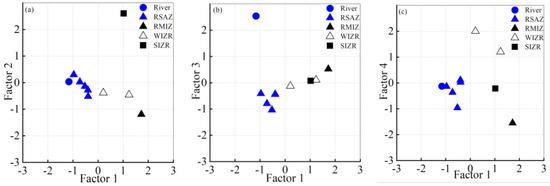 Plots of four factor scores showing the distribution of HCA-derived clusters: (a) factor 1 vs. factor 2; (b) factor 1 vs. factor 2; and (c) factor 1 vs. factor 3.
