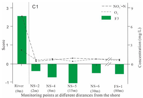 River water infiltration transports a large amount of DO into groundwater. As oxygen and organic carbon oxidation can provide the most energy for microorganisms, microorganisms tend to preferentially consume O2 to oxidize organic carbon [9]. When sufficient organic carbon is available, aerobic bacteria will continue to use DO until it is depleted, which explains the rapid decrease of DO concentration from 8.32 to 0.48 mg/L when river water infiltration reached NS2. After the depletion of DO, facultative anaerobic bacteria (aerobic or anaerobic bacteria) use NO3− as an electron acceptor, in which explains the rapid reduction of NO3−-N from 2.28 to 0.73 mg/L when river water infiltrated NS2. F3 representing aerobic respiration and denitrification exhibited high scores in river water and low scores in C1 (Figure 7), indicating the occurrence of strong aerobic respiration and denitrification during the infiltration of river water in C1, and O2 and NO3− from were depleted in river water, resulting in extremely low DO and NO3− concentrations in C1 groundwater.