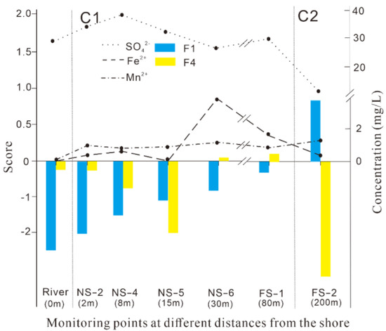 The variation of Mn2+ from NS1 to NS2 was the largest, increasing from 0.20 mg/L to 0.96 mg/L, and the variation of Fe2+ from NS5 to NS6 was the largest, increasing from 0.05 mg/L to 3.81 mg/L. SO42− decreased from 37.86 mg/L to 26.23 mg/L from NS4 to NS6. In addition, the fluctuation of F4 scores in the coastal zone (Figure 7) indicates that Mn (IV), Fe (III), and SO42− reduction occurred in this zone. But the scores of F1 and F4 were negative for the river and C1 and showed little change. Groundwater in this area is mainly affected by aerobic respiration and denitrification, while Mn (IV), Fe (III), and SO42− reduction and leaching have little effect on groundwater chemistry.