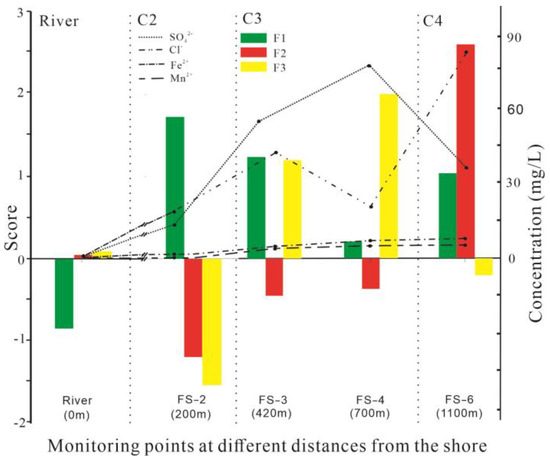 The concentrations of Na+, K+, and Cl− were high in the regional groundwater. Further, their concentrations increased along FS5–FS6 in C4 due to the mixing effect of regional groundwater. The high score of F2 indicates that the mixing effect of regional groundwater is the main influencing factor of groundwater chemistry in C4 (Figure 9).