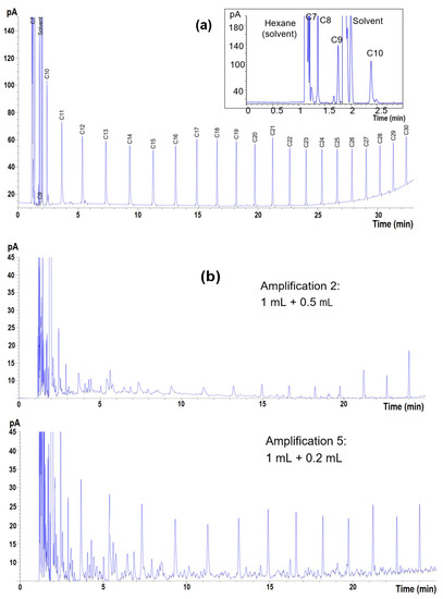 Calibration for crude oil analysis by GC-FID is shown in Figure 4a, in which a standard solution of C7–C30 alkanes was injected for alkanes identification, and signals of C7–C10 have been enlarged for better visualization. Two solvents were present in the chromatograms of crude oil characterization, hexane (solvent of n-alkanes standard solution) and DCM (extraction solvent of crude oil samples in water).