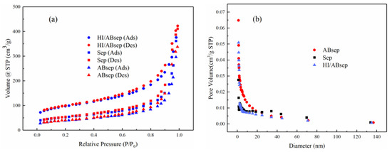 N2 adsorption–desorption isotherm at 77 K (a) and BJH pore size distribution (b) of Sep, ABsep, and HI/ABsep.